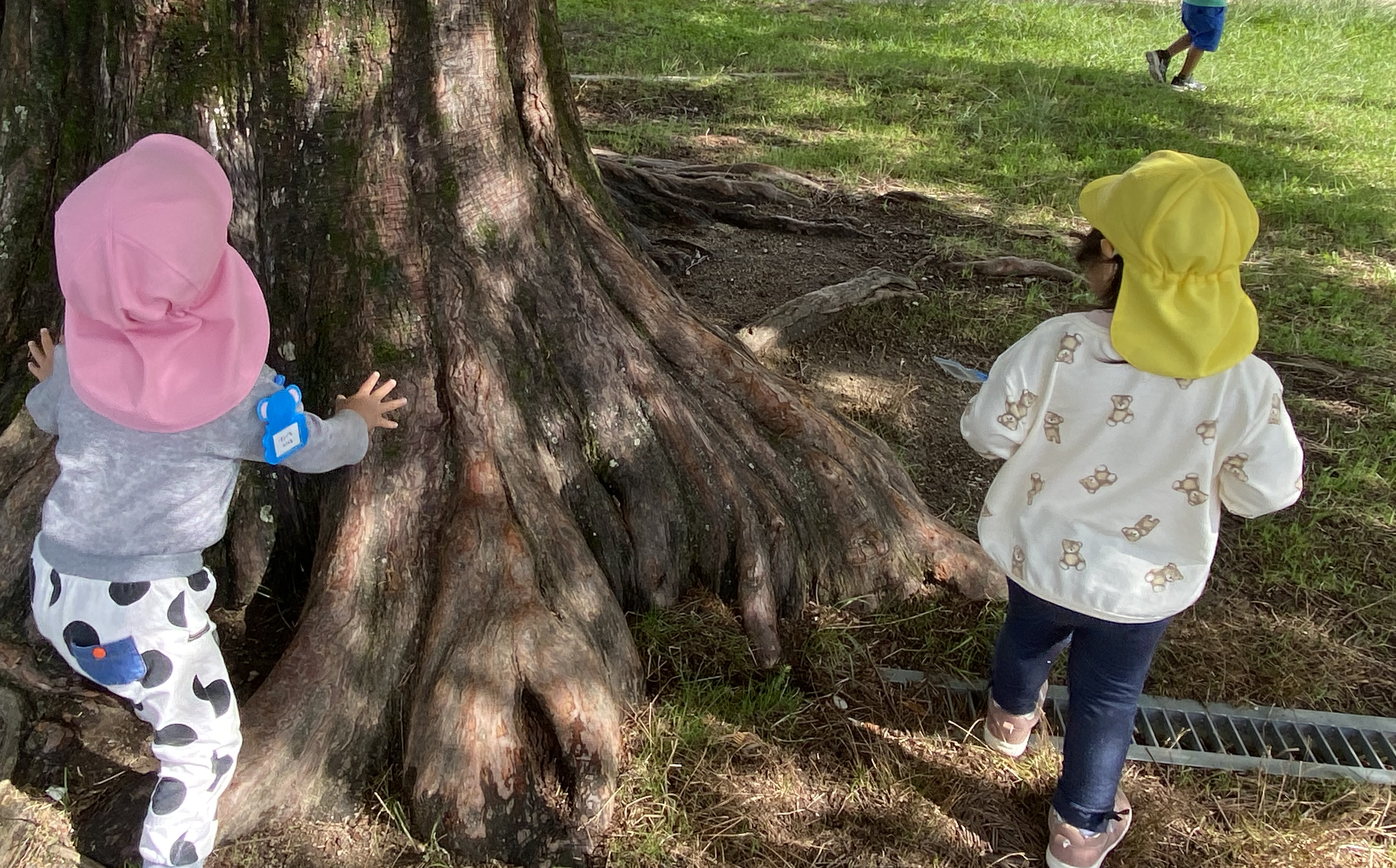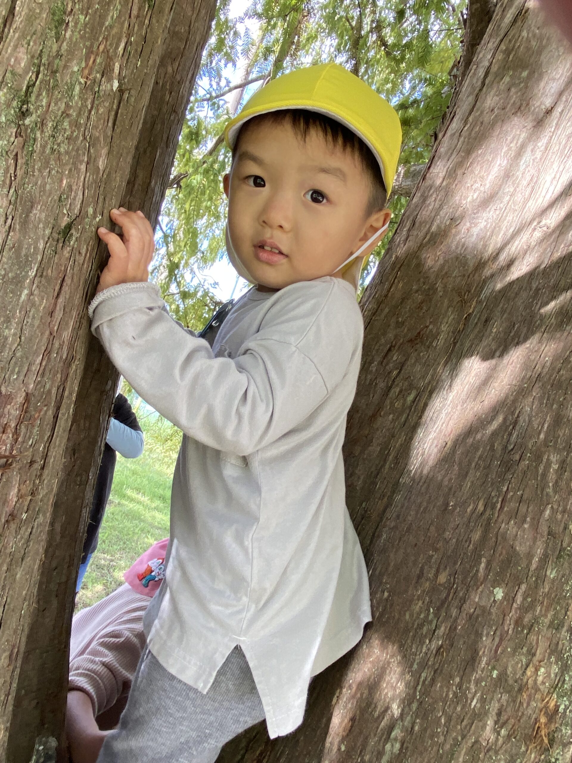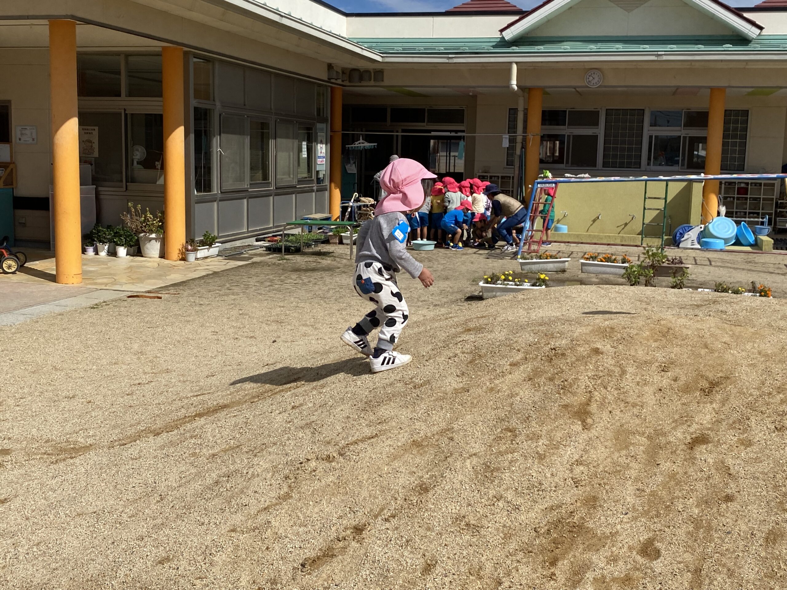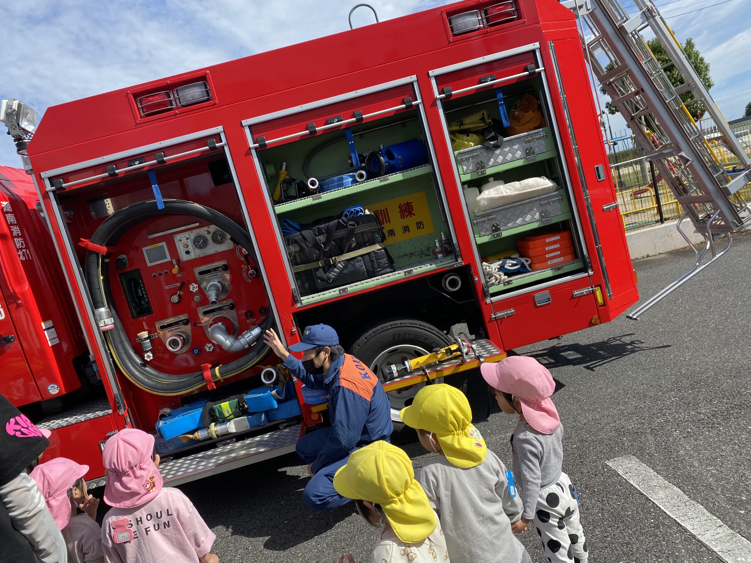 10 22 2022 2歳児交流 連携園の園庭で遊ばせてもらいました。 大きな保育園の園庭は興味津々なものがたくさんあります。 大きな木に登ったり、大きな築山に登ったり、広い園庭を探索したり その日は消防車も来ていて近くで迫力満点の消防車を見せてもらいました。