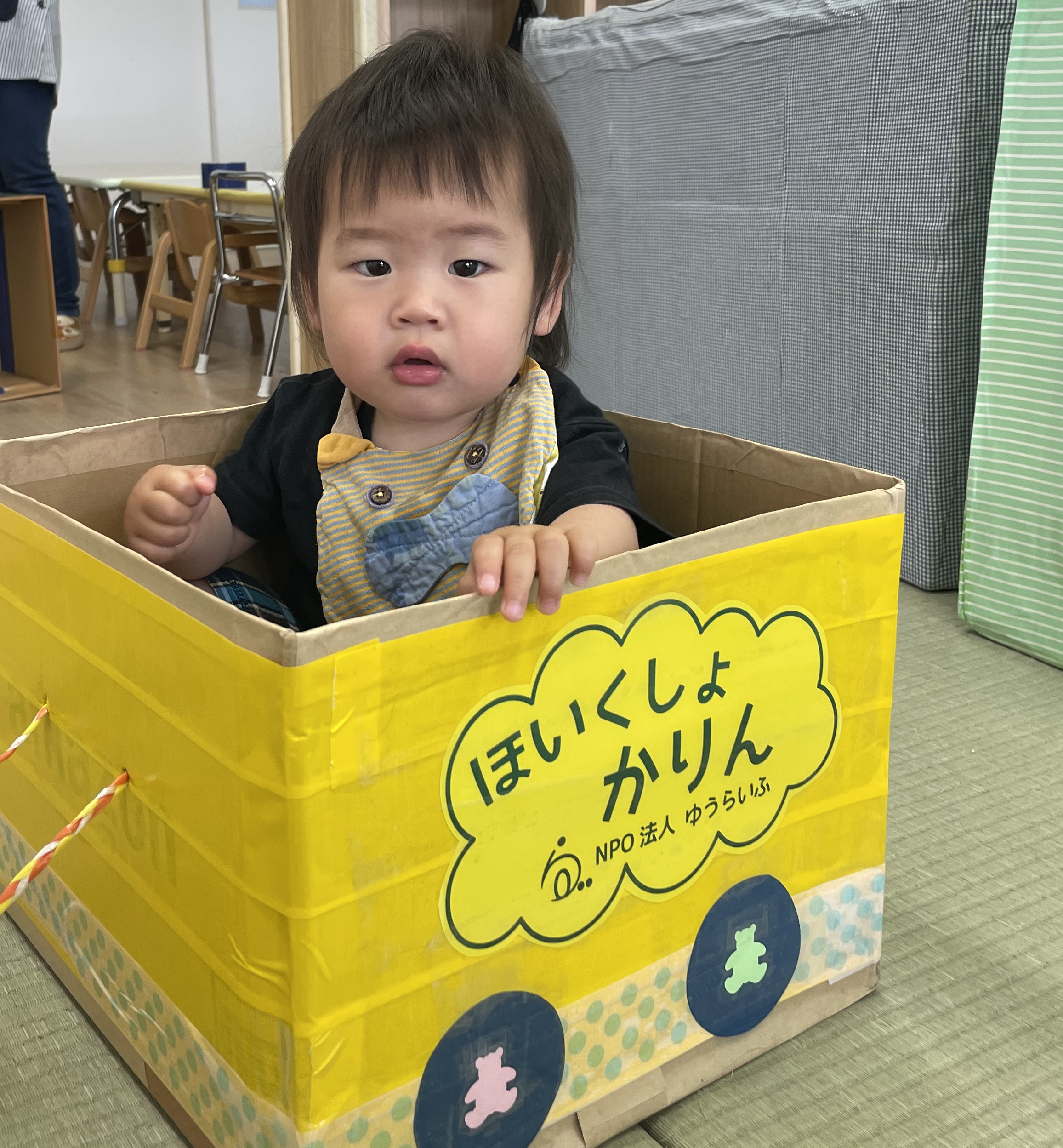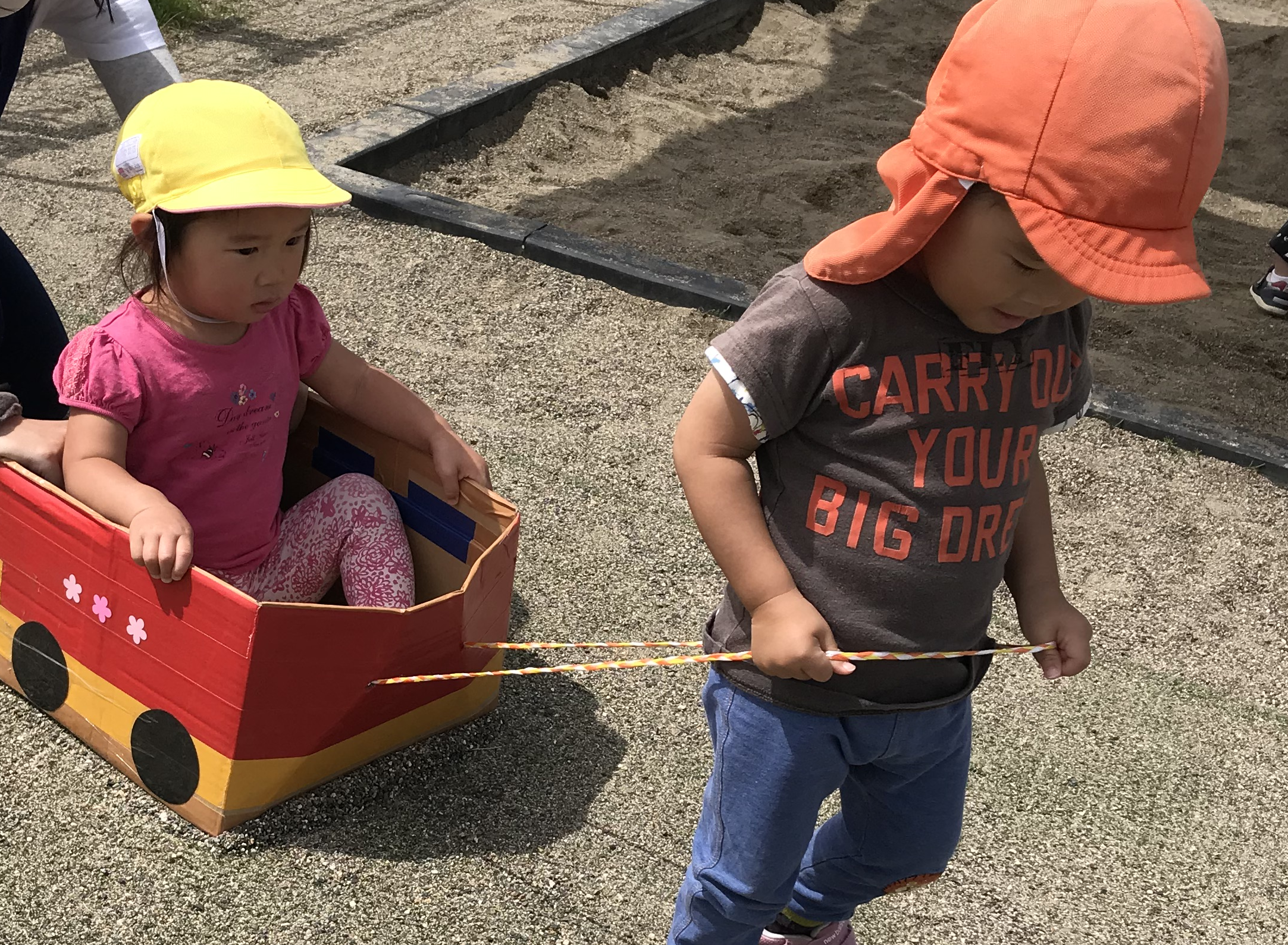 6 18 2022 6月の様子② ゆうらいふ号の完成です。 保育所かりんの車が出来上がりました。 さっそく乗ってみる子どもたち 小さいお友だちが乗ると2歳児さんが保育者のまねをして一緒に引っ張ってくれます。 ゆうらいふ号に乗って園庭を出発です。