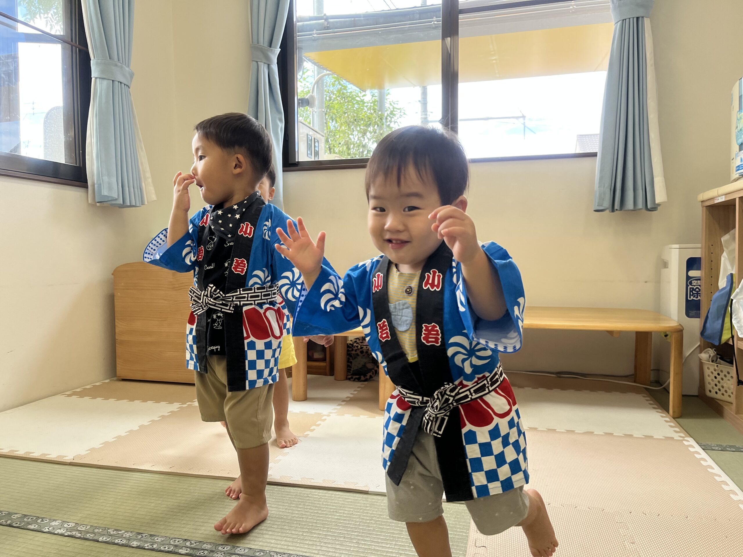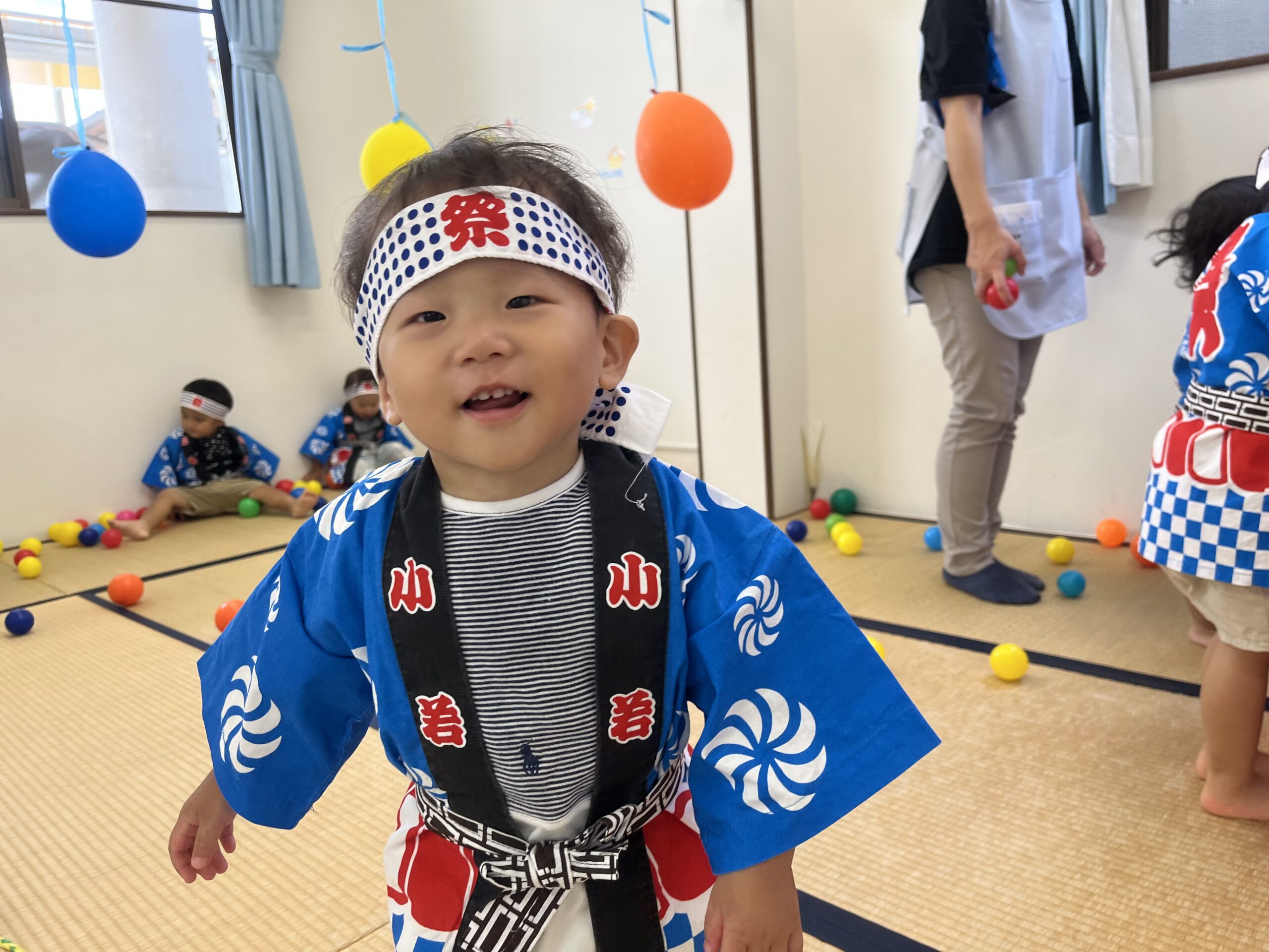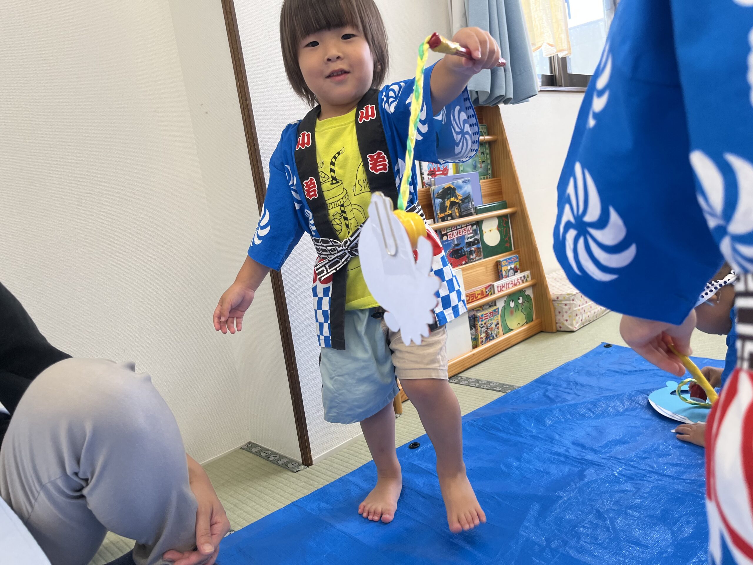 9 22 2022 夏祭り 少し遅くなってしまいましたが夏祭りを行いました。 はっぴを着て子どもたちはなんだかいつもと違う雰囲気に嬉しそうです。 盆踊りを踊ったり、魚釣り・ボール当てなど好きな遊びを選んで楽しみました。 お迎えの時には保護者の方と一緒にヨーヨー釣りです。 コロナ禍なので盛大な夏祭りができませんでしたが少しは親子でも夏祭りの雰囲気を楽しんでいただけていれば嬉しいです。